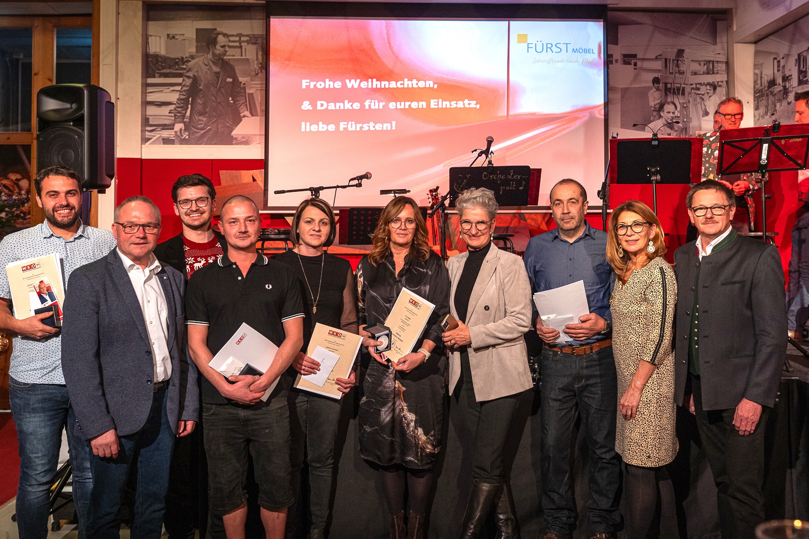 Auch 2023 feierten wir unsere Weihnachtsfeier in unserer ehemaligen Produktionsstätte, in der jetzigen Kulturwerkstatt TISCHLEREI Melk. Im Rahmen der Feier wurden unsere langjährigen Mitarbeiter von Vertreter:innen der Arbeiter- und Wirtschafskammer geehrt.