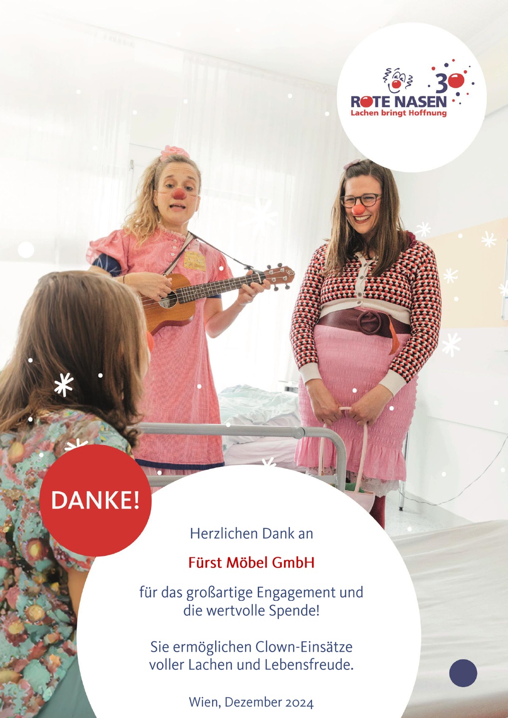 Die so wichtige Arbeit der Roten Nasen unterstützen wir auch im Jahr sehr gerne 2024 wieder! Die Roten Nasen bringen mit Humor und Menschlichkeit Freude dorthin, wo sie am dringendsten gebraucht wird.